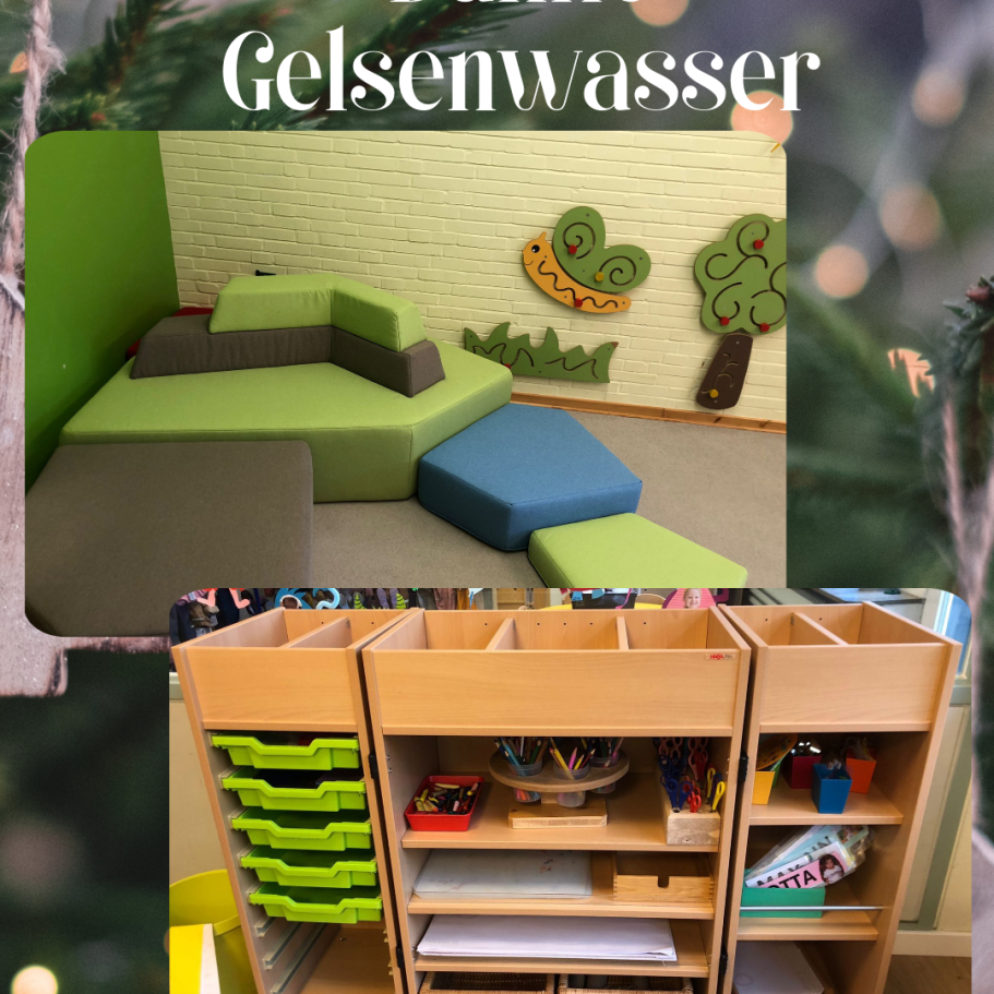 Es handelt sich um eine große Leseecke, in der nun viele Kinder Platz finden, um gemütlich zu lesen. Sie befindet sich momentan im Teppichraum. Außerdem haben wir einen großen Bastelwagen erhalten, der viele kreative Möglichkeiten bietet und sich praktisch zusammenklappen lässt. Wir wünschen den Kindern ganz viel Freude damit!